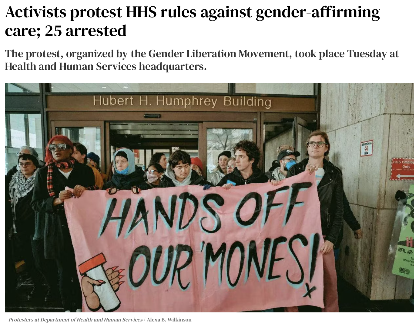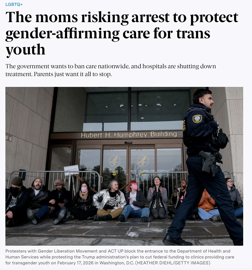 ‘Activists protest HHS rules against gender-affirming care; 25 arrested,’ The Advocate, February 2026